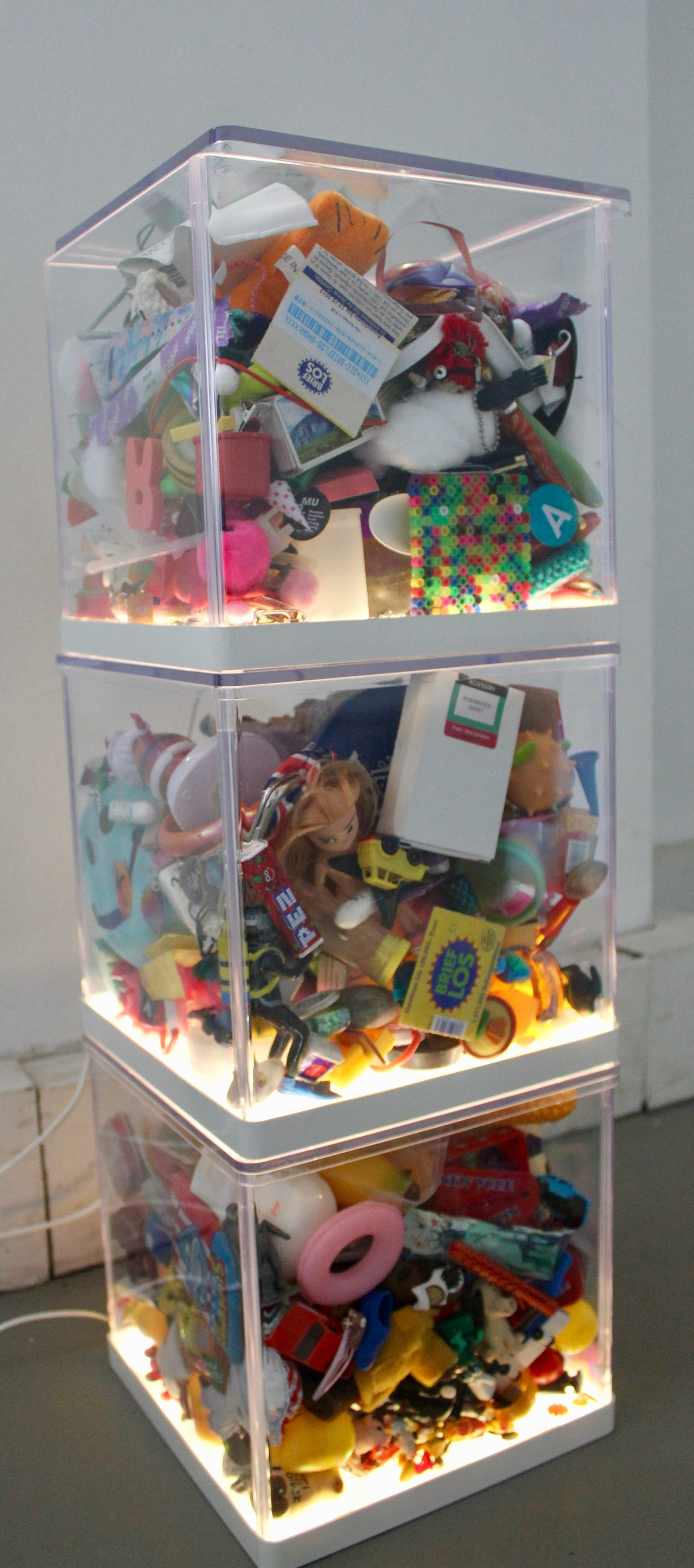 Angela Proyer hat Nippes und (ihr) wertvolle Dinge nicht weggeworfen, sondern zeigt in dieser Arbeit sehr persönliche Einblicke in ihre Vergangenheit. Das wohl älteste Ding in einem dieser 12 Cuben, die wahrscheinlich auch als eine Art (Selbst-)SchutzRaum herhalten (müssen), ist viele Jahrzehnte alt und stellt ein selbstgebasteltes Irgendetwas aus Kindergartentagen dar. Vermischt mit und neu arrangiert beleuchten Gegenstände, aus gefolgten Lebensbereichen und -zeiten, äußerst sensible, sehr intime Einblicke in ihrer Biografie und verbinden HIER ihr Inneres mit einem Außen, das Vernetzen im JETZT wird her- und bereitgestellt